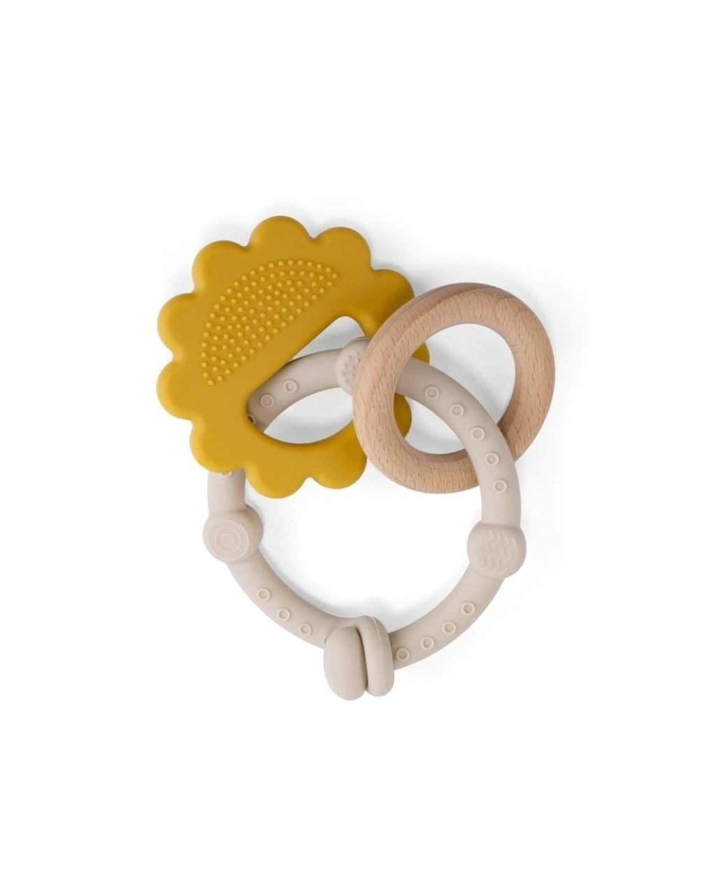 Diseño circular con textura sensorial para aliviar encías, desarrollar el agarre y promover la motricidad fina.